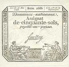 50 sous, 25 sous et 20 livres et une planche de 25 sous, 50 sous, 5 livres, 20 livres.